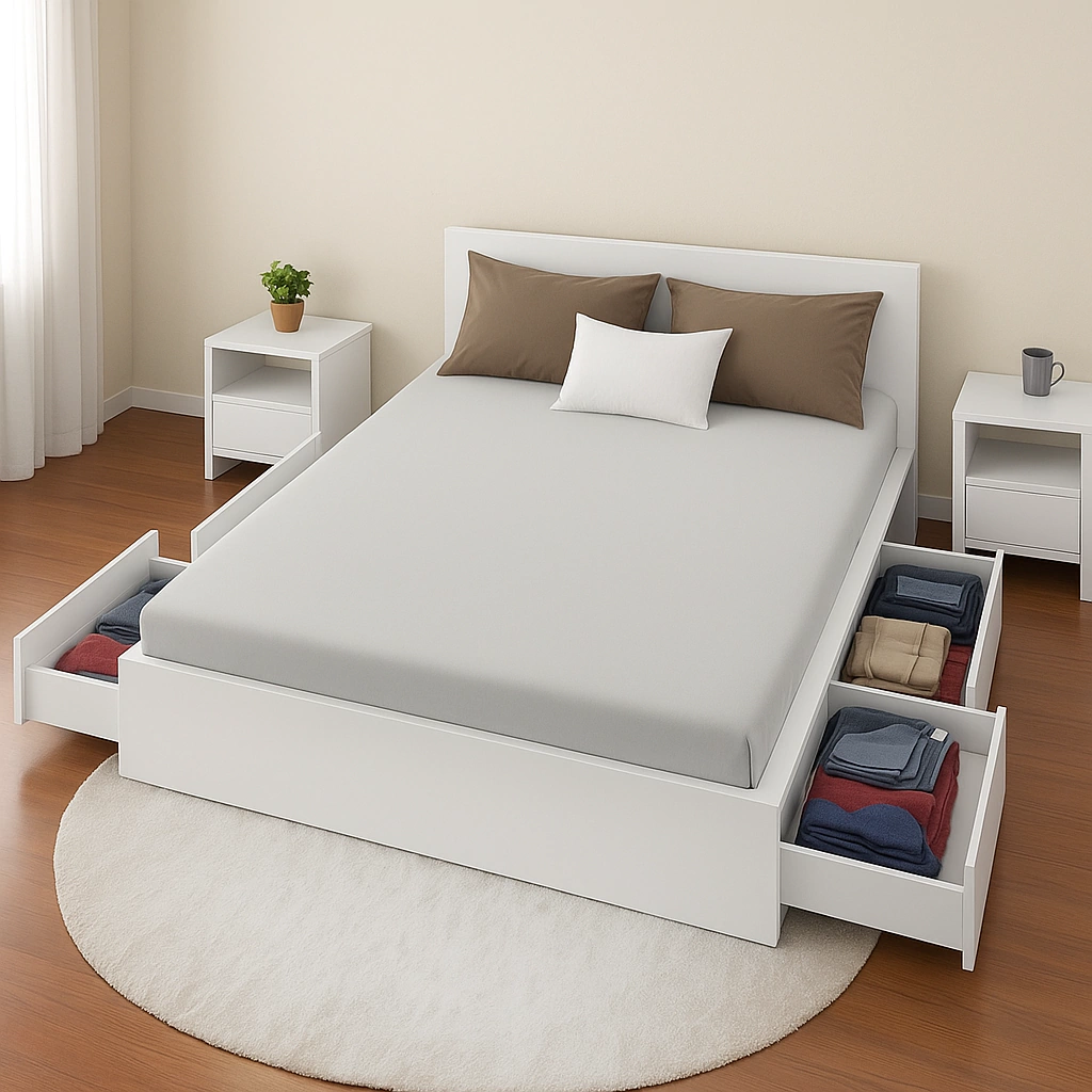 Esta cama está diseñada especialmente para colchones con medidas ajustadas para garantizar comodidad y practicidad. Cuenta con cuatro cajones espaciosos y dos bauleras integradas, perfectos para almacenar ropa de cama, prendas o cualquier otro objeto, manteniendo tu dormitorio siempre ordenado.