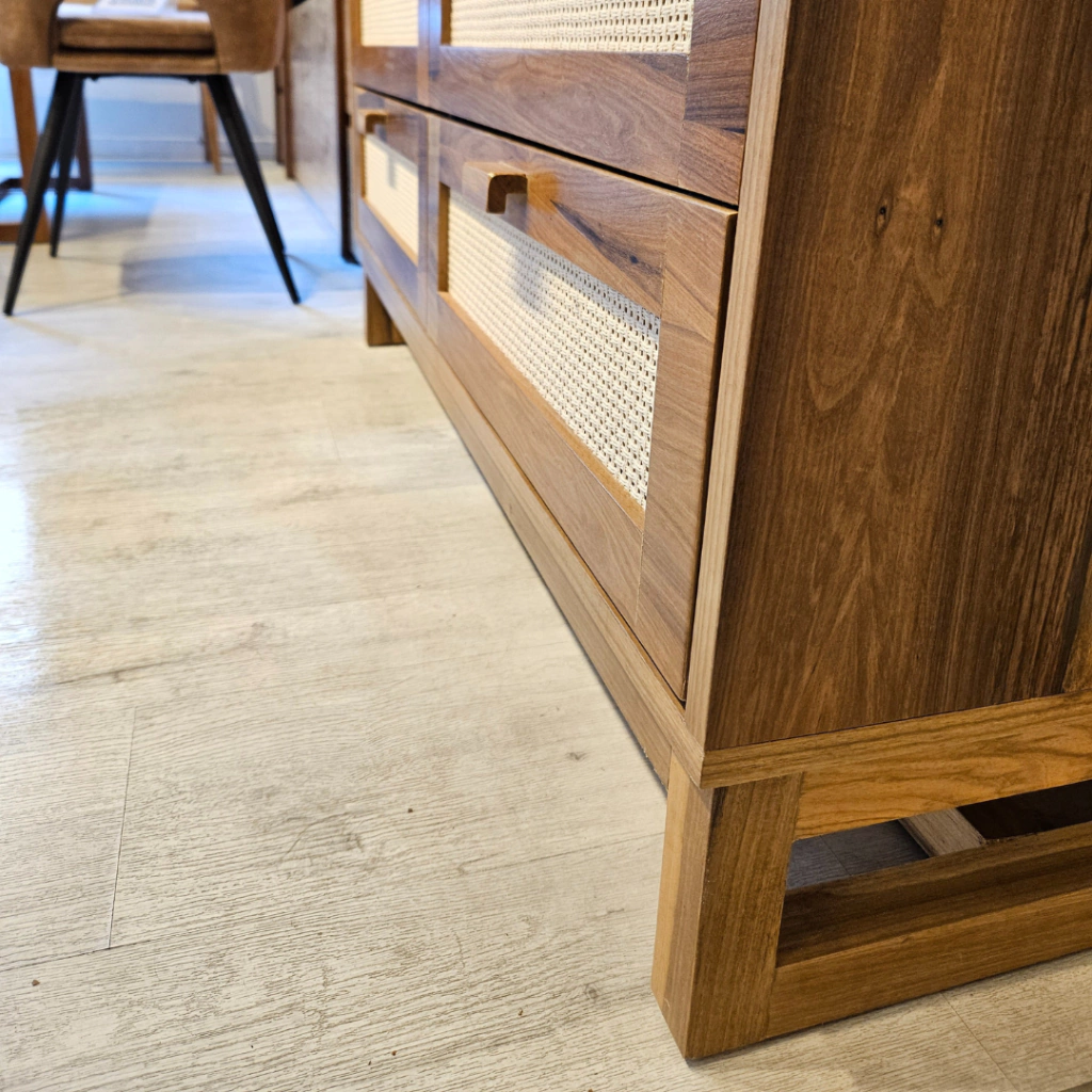 Descubrí la elegancia natural y funcionalidad de la Cómoda Polo, una pieza diseñada especialmente para quienes valoran la calidad y el estilo atemporal. Fabricada en MDF enchapado con madera de petiribi, esta cómoda combina la calidez de la madera con detalles únicos que aportan un toque japandi moderno a cualquier ambiente.