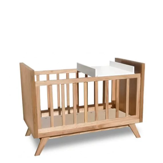Esta cuna combina la calidez de la madera de Paraíso con lustre natural y el acabado blanco laqueado en el cambiador, logrando un estilo nórdico moderno y elegante que armoniza con cualquier ambiente.